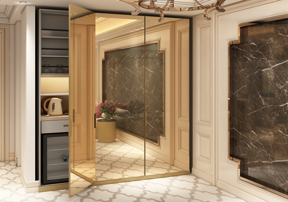 مینیبار با کمد یخچال مخفی بلند و طبقهدار با درب آینهای رز تیپ 4720