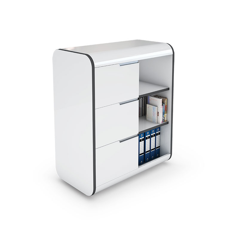 ویژگی‌ها دارای 3 کشو جهت نگهداری پوشه‌های استاندارد، دارای قفل مرکزی اتولاک، دارای 3 طبقه بدون درب برای کتاب، زونکن و لوازم تزئینی